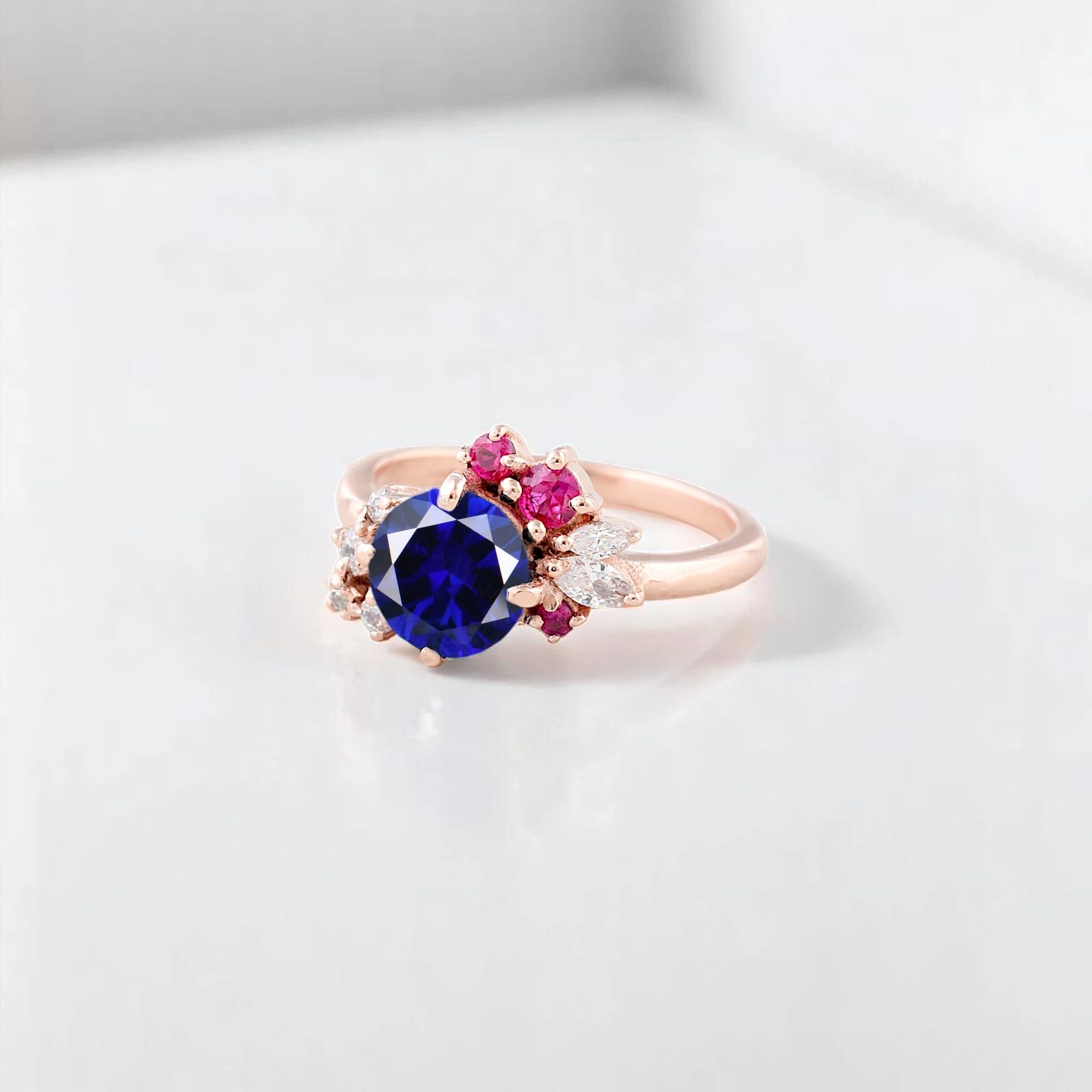 Exquisite Round-Cut Blue Sapphire & Ruby Accent 14K Gold Engagement Ring – Timeless Elegance for Her