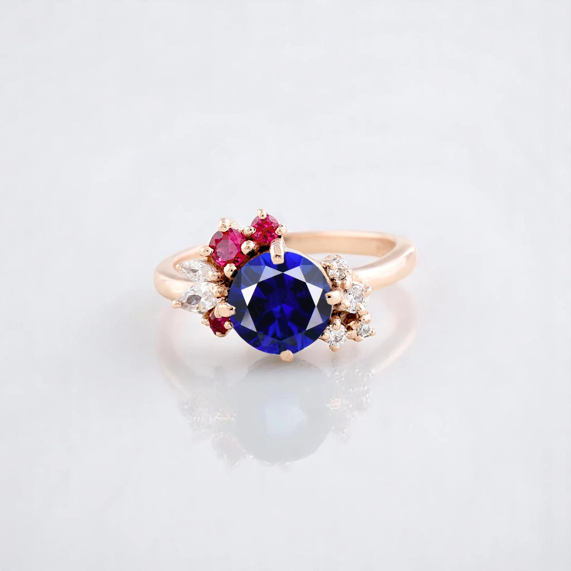 Be the first to review “Exquisite Round-Cut Blue Sapphire & Ruby Accent 14K Gold Engagement Ring – Timeless Elegance for Her”